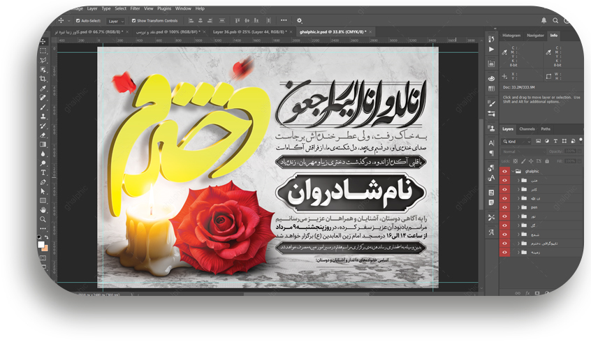 اعلامیه ترحیم دختر با طراحی خاص و تایپوگرافی اختصاصی دخترم، انتخابی مناسب برای اطلاعرسانی مراسمهای سوم، هفتم و سالگرد است. این فایل PSD لایهباز با کیفیت چاپی استاندارد (رزولوشن 300، مد رنگی CMYK) آماده ویرایش بوده و چاپخانهها و طراحان میتوانند به سرعت متنها و اطلاعات مراسم را جایگزین کرده و برای چاپ انبوه آماده کنند. استفاده از المانهایی مانند شمع، گل سرخ و بکگراند سنگی، زیبایی و سنگینی لازم برای یک اعلامیه رسمی را به همراه دارد.