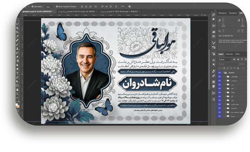 این اعلامیه ترحیم، با یک طراحی مدرن و چیدمان متعادل از رنگهای آبی، سفید ارائه شده است. در سمت راست طرح، محل قرارگیری عکس پدر قرار دارد گوشه طرح گلهای PNG اختصاصی به رنگهای آبی تزئین شده است. پروانههای آبی که به صورت اختصاصی هستند، در فضای طرح در پرواز هستند. بخش متنی در سمت چپ، برای درج اطلاعات مراسم در نظر گرفته شده است.