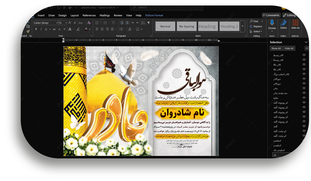 ویرایش المانهای گرافیکی: توجه داشته باشید که تصاویر PNG (مانند گلها) برای جابجایی و حذف مناسب هستند، اما محتوای درونی آنها (مثلاً تغییر رنگ گل) در Word قابل ویرایش نیست. برای تغییرات اساسی در المانهای گرافیکی، میتوانید طرحی تقریبا مشابه راه به صورت لایه باز و با عکس مرحومه از این اینجا دانلود کنید