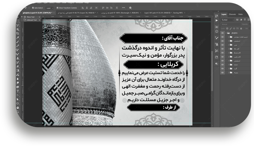 این پوستر پیام تسلیت، با طراحی مذهبی و ویژه برای تسلیت به خانواده پدران کربلایی ارائه شده است. در سمت راست طرح، نماد مناره و گنبد حضرت عباس(ع) به شکلی باشکوه طراحی شده است. در سمت چپ طرح، فضای کامل متن تسلیت قرار دارد که شامل موارد زیر میباشد: