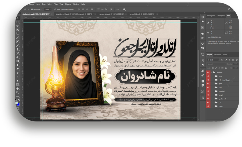 دانلود قالب لایهباز اعلامیه ترحیم دختر با فرمت PSD، رزولوشن 300 و ابعاد A4. شامل قاب عکس، فانوس و المانهای گرافیکی قابل ویرایش. مناسب برای چاپخانهها و طراحان گرافیک.