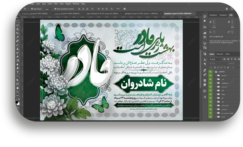 تمامی المانهای طرح از جمله پرده کرم رنگ، قاب طلایی، کبوترها و تزئینات جانبی به صورت لایهباز و قابل ویرایش طراحی شدهاند. کیفیت 300 DPI و استفاده از مد رنگی CMYK، تضمینکننده خروجی چاپی باکیفیت برای مراسم سوم، هفتم، چهلم و سالگرد است. پوشهبندی منظم لایهها و همراهی فونتهای مورد استفاده، ویرایش طرح را برای همه کاربران امکانپذیر میسازد.