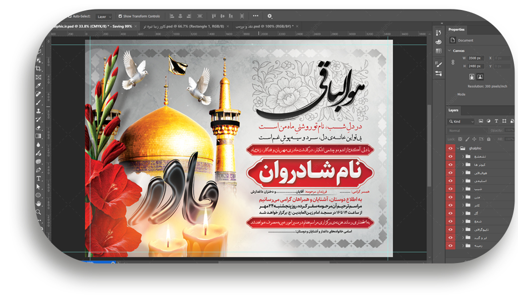 المانهای PNG باکیفیت (گنبد، گل شمشیری، شمعها اسلیمی زیر تایپوگرافی هوالباقی) را میتوانید جابجا کرده و تغییرات دلخواه را اعمال کنید.
