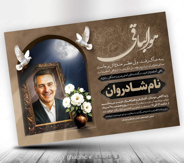 این اعلامیه ترحیم، با طراحی و زیبا برای بزرگداشت پدر ارائه شده است. فضای اصلی طرح را یک دیوار خشتی تشکیل میدهد که پنجرهای در آن قرار دارد و نور آرام ماه از بیرون به داخل میتابد. روی طاقچه پنجره، یک قاب عکس و یک گل سفید قرار گرفته است. این ترکیب، فضایی آرام و یادبودی خلق کرده است. در سمت چپ طرح، فضای مناسبی برای درج متن و اطلاعات مراسم در نظر گرفته شده است.