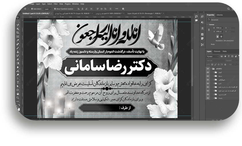 این پوستر برای عرض تسلیت و همدردی با بازماندگان مرحوم طراحی شده و میتواند توسط افراد، سازمانها و ادارات مختلف برای ارسال پیام تسلیت مورد استفاده قرار گیرد. این قالب لایهباز با مشخصات فنی استاندارد شامل فرمت PSD، ابعاد A4، رزولوشن 300 DPI، مد رنگی CMYK و رعایت حاشیه ایمنی ۵ میلیمتری آماده شده است. فونتهای استفاده شده در طرح به صورت رایگان همراه فایل ارائه میشوند و یک راهنمای GIF برای باز کردن صحیح لایهها نیز شامل محصول شده است. تمامی المانهای طرح با کیفیت بالا ارائه شدهاند.