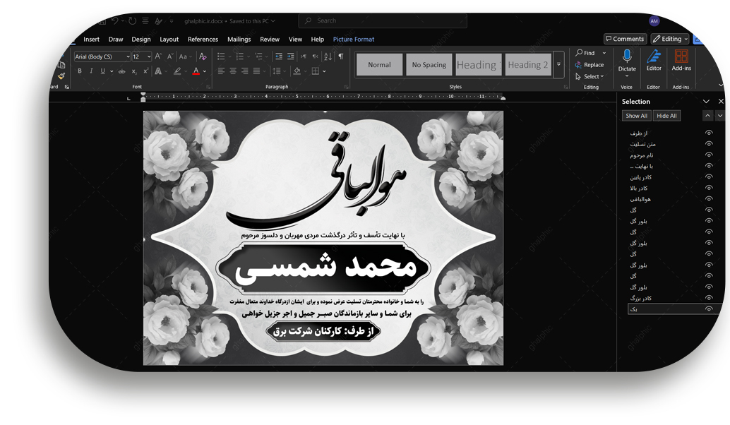 ما برای راحتی و دسترسی بیشتر شما، پوستر تسلیت را به صورت فایل آماده Microsoft Word (با پسوند .docx) طراحی و ارائه میدهیم. هدف ما این است که هر شخصی، بدون نیاز به نرمافزار تخصصی و تنها با استفاده از Microsoft Word بتواند متن و مشخصات را به سرعت ویرایش و آمادهی چاپ کند.این پوستر تسلیت سیاه و سفید کلاسیک و تایپوگرافی اختصاصی هوالباقی که برای اولین بار توسط قالفیک طراحی شده است. این پوستر با حاشیهای از گلهای ظریف و کادر مرکزی سفید، فضایی مناسب برای درج متن تسلیت، نام مرحوم و نام فرستنده فراهم میکند