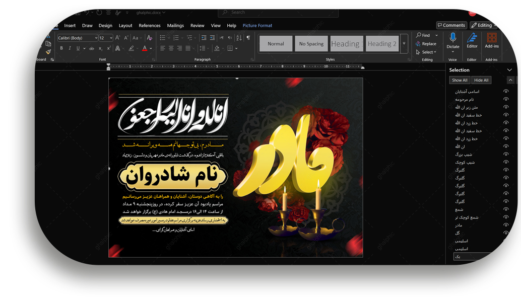 ما برای راحتی و دسترسی بیشتر شما، اعلامیههای ترحیم را به صورت فایل آماده Microsoft Word (با پسوند .docx) طراحی و ارائه میدهیم. هدف ما این است که هر شخصی، بدون نیاز به نرمافزار تخصصی و تنها با استفاده از Microsoft Word بتواند متن و مشخصات مراسم خود را به سرعت ویرایش و آمادهی چاپ کند.طرحی برای اطلاعرسانی مراسم ترحیم مادر، با رنگ مشکی اصیل و تایپوگرافی سهبعدی طلایی. این اعلامیه با گلهای قرمز و اسلیمی در پسزمینه، همراه با شمعهای نمادین و طراحی إنَّا لِلَّهِ ، یک ترکیب مناسب ترحیم ایجاد کرده است.