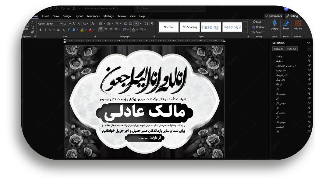 ما برای راحتی و دسترسی بیشتر شما، پوستر تسلیت را به صورت فایل آماده Microsoft Word (با پسوند .docx) طراحی و ارائه میدهیم. هدف ما این است که هر شخصی، بدون نیاز به نرمافزار تخصصی و تنها با استفاده از Microsoft Word بتواند متن و مشخصات را به سرعت ویرایش و آمادهی چاپ کند