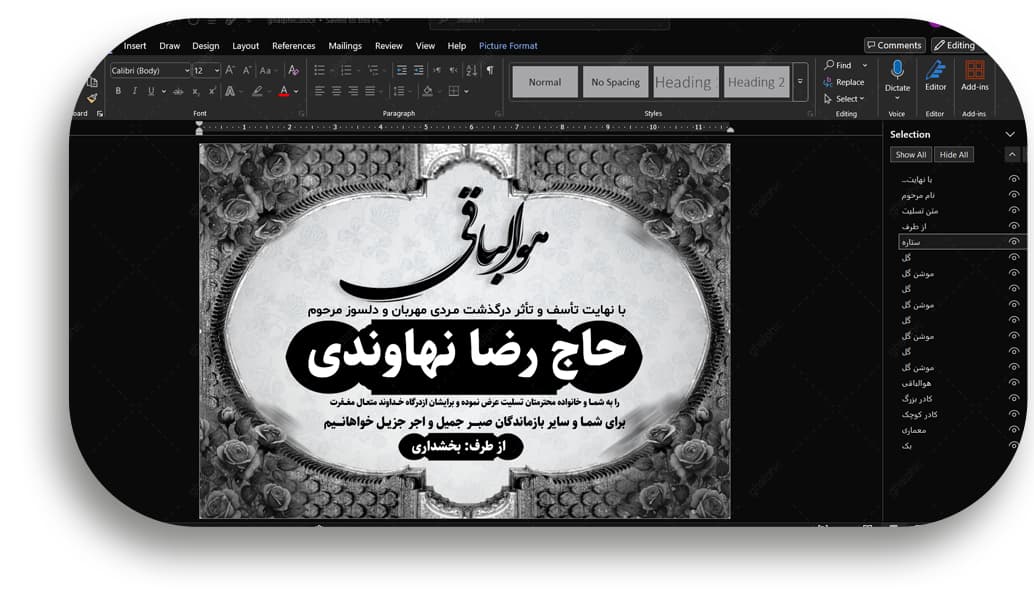 ما برای راحتی و دسترسی بیشتر شما، پوستر تسلیت را به صورت فایل آماده Microsoft Word (با پسوند .docx) طراحی و ارائه میدهیم. هدف ما این است که هر شخصی، بدون نیاز به نرمافزار تخصصی و تنها با استفاده از Microsoft Word بتواند متن و مشخصات را به سرعت ویرایش و آمادهی چاپ کند