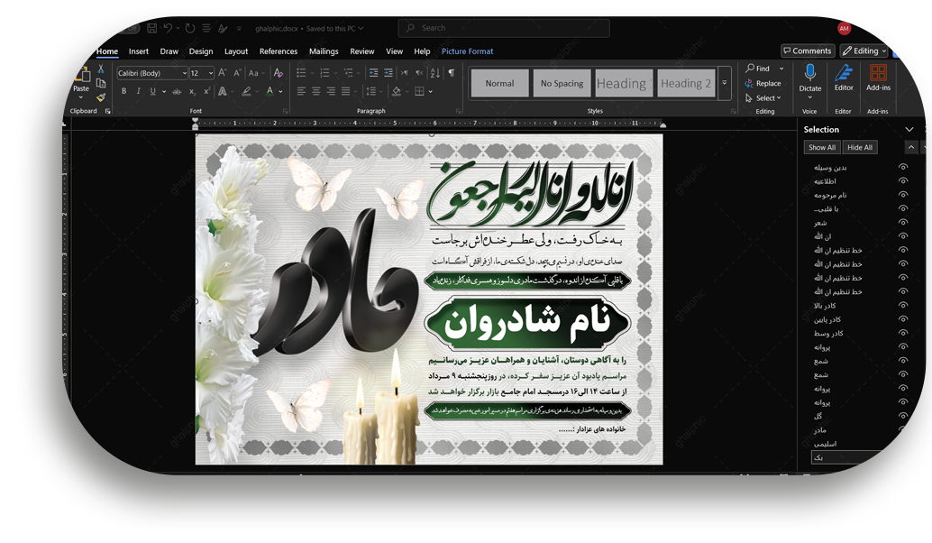 ما برای راحتی و دسترسی بیشتر شما، اعلامیههای ترحیم را به صورت فایل آماده Microsoft Word (با پسوند .docx) طراحی و ارائه میدهیم. هدف ما این است که هر شخصی، بدون نیاز به نرمافزار تخصصی و تنها با استفاده از Microsoft Word بتواند متن و مشخصات مراسم را به سرعت ویرایش و آمادهی چاپ کند.