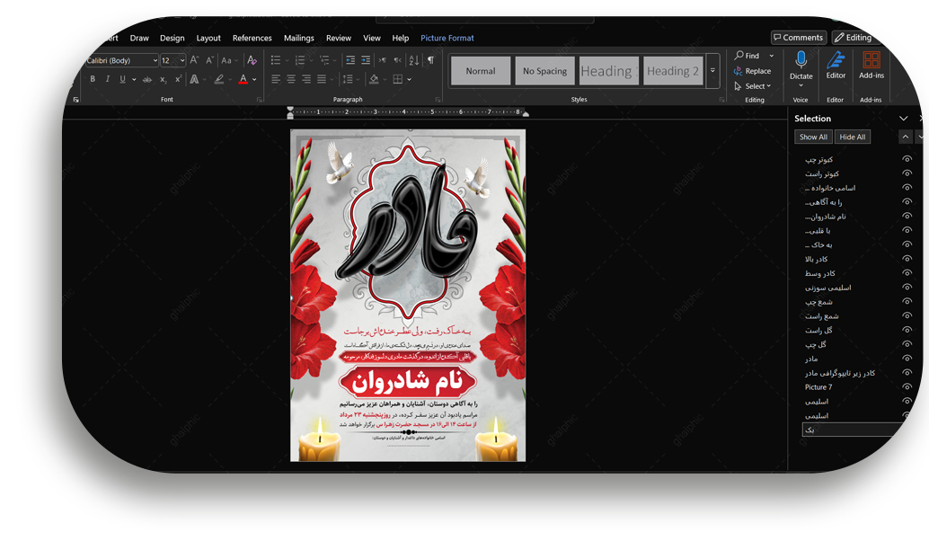 ویرایش المانهای گرافیکی: توجه داشته باشید که تصاویر PNG (مانند گلها) برای جابجایی و حذف مناسب هستند، اما محتوای درونی آنها (مثلاً تغییر رنگ گل) در Word قابل ویرایش نیست. برای تغییرات اساسی در المانهای گرافیکی، میتوانید طرحی مشاب راه به صورت لایه باز از این اینجا دانلود کنید