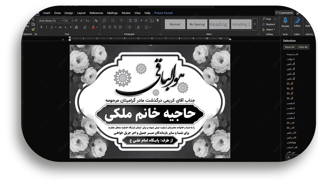 ویرایش سریع متن: شما میتوانید همه متنها شامل نام فرستنده، نام مرحوم متن تسلیت و از طرف... را مستقیماً در Word عوض کنید. (فونتهای استفاده شده نیز همراه فایل ارائه میشوند). جابجایی آسان المانها: تصاویر PNG به راحتی در محیط Word قابل جابجا کردن یا حذف هستند، و حتی خود png ها هم در پوشه جداگانه همراه پوشه محصول قرار داده ایم