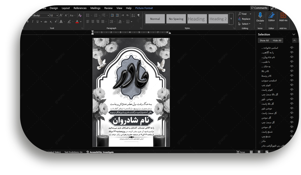 ویرایش سریع متن: شما میتوانید همه متنها شامل نام، تاریخ، مکان مراسم و... را مستقیماً در Word عوض کنید. (فونتهای استفاده شده نیز همراه فایل ارائه میشوند). جابجایی آسان المانها: تصاویر PNG به راحتی در محیط Word قابل جابجا کردن یا حذف هستند.