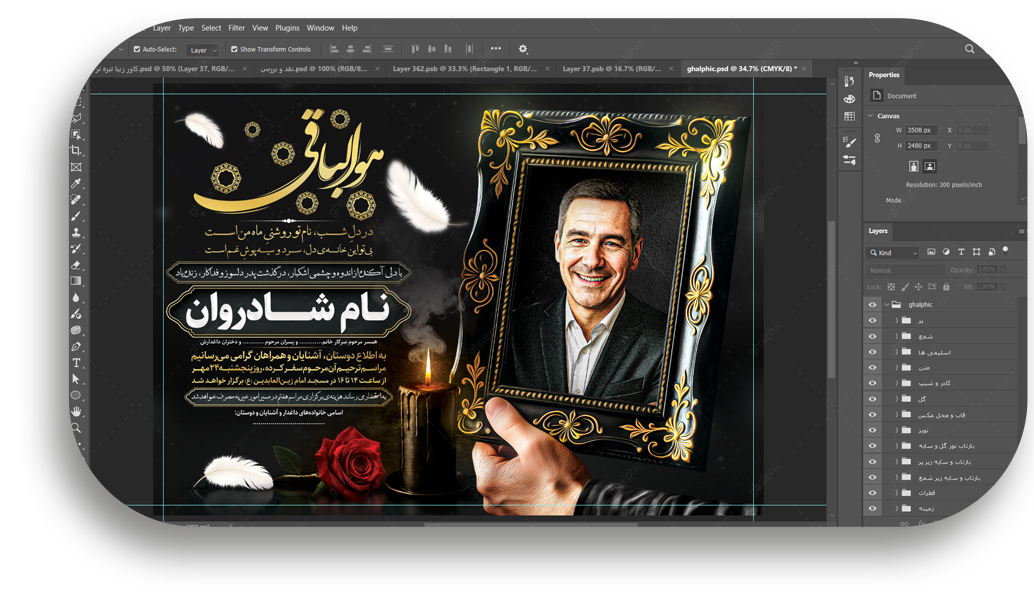 در سمت چپ طرح، یک ایده خلاقانه اجرا شده است: یک دست که قاب عکس پدر را نگه داشته و در کنار آن شمع و پر و گل رز قرمز قرار دارد.برای ایجاد جلوه طبیعی، سایه این المانها یعنی بازتاب نور خود اینها روی سطح زیرین به صورت واقعی طراحی شده است. برای جلوگیری از افزایش حجم فایل، این جلوههای سایه به صورت PNG ثابت ارائه شدهاند و امکان تغییر میزان بلور یا ماسک آنها وجود ندارد. البته شما میتوانید با ابزارهای فتوشاپ، افکت بلور جدیدی برای آنها ایجاد کنید.برای زیبایی بیشتر داخل کادر ها یه JPG قرار داده شدهاند. توجه داشته باشید که در صورت افزایش سایز طرح، این بخش ممکن است دچار کاهش کیفیت شود. چند پر دیگر به صورت معلق در فضای طرح قرار گرفتهاند.
