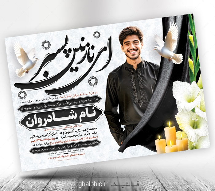اعلامیه ترحیم جوان ناکام پسر | طراحی لایهباز با تایپوگرافی ای نازنین پسر