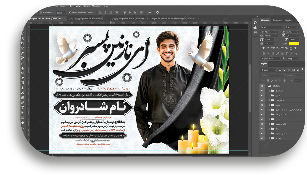 این آگهی ترحیم جوان ناکام با مشخصات فنی استاندارد شامل فرمت PSD، ابعاد A4، رزولوشن 300 DPI، مد رنگی CMYK و رعایت حاشیه ایمنی ۵ میلیمتری آماده شده است. فونتهای استفاده شده در طرح به صورت رایگان همراه فایل ارائه میشوند و یک راهنمای GIF برای باز کردن پوشه لایهها در فتوشاپ همراه فایل قرار داده شده است