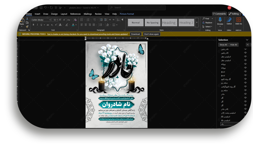 ویرایش المانهای گرافیکی: توجه داشته باشید که تصاویر PNG (مانند گلها) برای جابجایی و حذف مناسب هستند، اما محتوای درونی آنها (مثلاً تغییر رنگ گل) در Word قابل ویرایش نیست. برای تغییرات اساسی در المانهای گرافیکی، میتوانید طرحی تقریبا مشابه راه به صورت لایه باز و با عکس مرحومه از این اینجا دانلود کنید