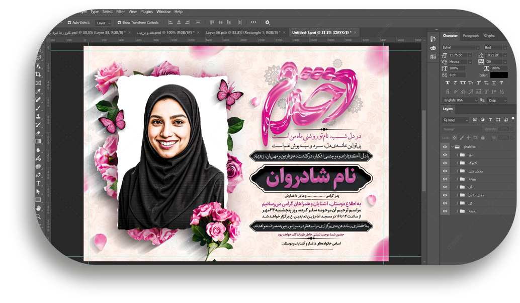 این اعلامیه ترحیم دختر لایهباز با مشخصات فنی استاندارد شامل فرمت PSD، ابعاد A4، رزولوشن 300 DPI، مد رنگی CMYK و رعایت حاشیه ایمنی ۵ میلیمتری آماده شده است. فونتهای استفاده شده در طرح به صورت رایگان همراه فایل ارائه میشوند و یک راهنمای GIF برای باز کردن پوشه لایهها در فتوشاپ قرارداده شده است و همچنین فایل ایلاستریتور اسلیمی داخل طرح هم که زیر تایپوگرافی دخترم است نیز قرار داده ایم