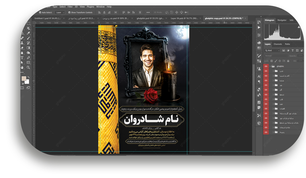 این اعلامیه ترحیم جوان ناکام با طراحی زیبا و مذهبی ارائه شده است. در سمت راست طرح، گنبد و مناره حضرت عباس(ع) به همراه قاب عکس جوان ناکام طراحی شده است. در کنار مناره، قاب عکس قرار دارد و در زیر آن گل و شمع دیده میشود. بازتاب نور(یعنی تصویر) قاب، شمع و گل روی سطح پایین به زیبایی طراحی شده است. توجه داشته باشید که این جلوههای بازتاب به صورت PNG ثابت هستند و امکان تنظیم بلور آنها وجود ندارد، اما شما میتوانید با ابزارهای فتوشاپ تغییرات مورد نظر خود را اعمال کنید. در سمت بالای طرح، بخش متن قرار دارد، در فضای کلی طرح، ماه با نور قابل تنظیم و پرهای زیبا به صورت PNG طراحی شده است.