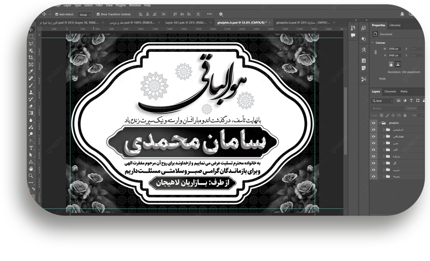این پوستر پیام تسلیت، با طراحی زیبا و رنگبندی سیاه و سفید ارائه شده است. در چهار گوشه طرح از گلهای تزئینی استفاده شده و در مرکز آن، کادرهای بزرگ اختصاصی طراحی شده توسط قالفیک قرار دارد. بکگراند مشکی طرح با اسلیمیهای زیبا و اختصاصی به صورت PNG تزئین شده است.
