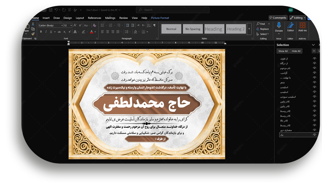 ویرایش سریع متن: شما میتوانید همه متنها شامل نام فرستنده، نام مرحوم متن تسلیت و از طرف... را مستقیماً در Word عوض کنید. (فونتهای استفاده شده نیز همراه فایل ارائه میشوند). جابجایی آسان المانها: تصاویر PNG به راحتی در محیط Word قابل جابجا کردن یا حذف هستند.
