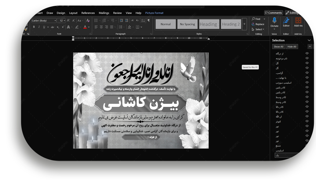 ویرایش سریع متن: شما میتوانید همه متنها شامل نام فرستنده، نام مرحوم متن تسلیت و از طرف... را مستقیماً در Word عوض کنید. (فونتهای استفاده شده نیز همراه فایل ارائه میشوند). جابجایی آسان المانها: تصاویر PNG به راحتی در محیط Word قابل جابجا کردن یا حذف هستند.