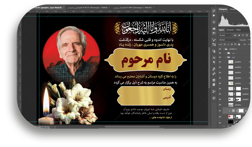 فایل به صورت PSD (فتوشاپ) ارائه شده و تمامی لایهها بهصورت منظم، گروهبندی شده و قابل ویرایش هستند. امکان تغییر نام مرحوم، تاریخ، ساعت، مکان مراسم، تصویر و سایر بخشها وجود دارد.