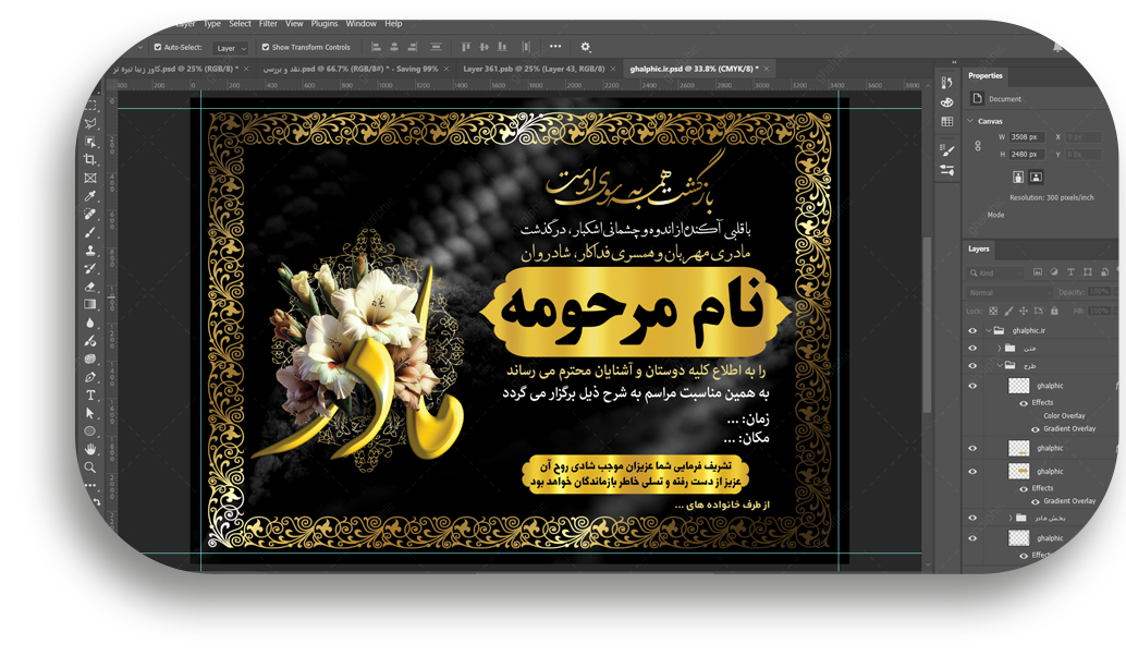 آگهی ترحیم مادر psd قابل ویرایش در فتوشاپ می باشد، فرمت فایل psd و قابل ویرایش در برنامه فتوشاپ می باشد و شما عزیزان می توانید تغییرات خودتان را اعمال کنید.طرح اعلامیه مارد با قیمت پایین در دسترس شما بزرگواران قرار گرفته است، تمامی متن های قابلیت ویرایش کامل دارند، تایپوگرافی ها و کادر ها و بقیه المان های طرح png هستند و قابلیت ویرایش و جابجایی را دارا هستند، و می توانید شخصی سازی کنید، در این اعلامیه برای اماده کردن برای مراسم ترحیم فقط باید متن ها را ویرایش کنید که پوشه متن ها هم مشخص کردیم داخل طرح و خیلی هم نیاز به علم تخصصی طراحی ندارید، این طرح به طور پیش فرض برای مراسم سوم اماده شده اما با تغییر متن ها برای مراسم هفتم و چهلم و سلگرد هم می توانید استفاده کنید.