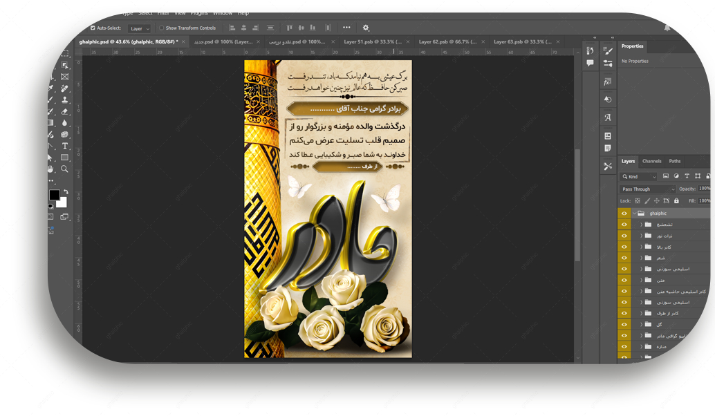 استوری تسیلت با لایه بندی منظم می باشد، بک این استوری تسلیت با پترن گل به رنگ کرم با فرمت jpg، و مناره حضرت عباس که در کنار طرح قرار دارد، در پوشه جداگانه و افکت به آن داده شده است، و گل ها رو برو هم بر روی آن ها کار گرافیکی شده گل ها لای ها جدا نیست تمام گل و برگ یک لایه و به صورت png هستند، و توسط هوش مصنوعی ساخته شدن، شعر حافط و متن و متن ها همگی باز و قابل ویرایش هستند وکادر ها و اسلمی های طرح نیز وکتور هستند بجز استوری حاشیه متن که png است. و قابلیت افزایش سایز بدون افت کیفیت را دارا هستند. و همچنین تایپوگرافی مادر که به صورت وکتور است و قابلیت افزایش سایز کاملا دلخواه را دارا می باشند، می توانید، راحت لایه ها رو شناسایی و راحت ویرایش کنید چون تمام لایه های مرتبط با هم در پوشه مجزا با اسم فارسی نوشته شده اند.